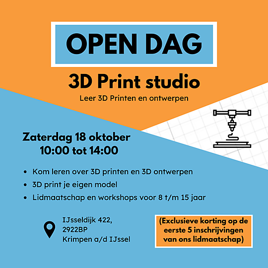 Het is zover! Op zaterdag 18 oktober vieren we de officiële opening van onze 3D Print Studio met een open dag.